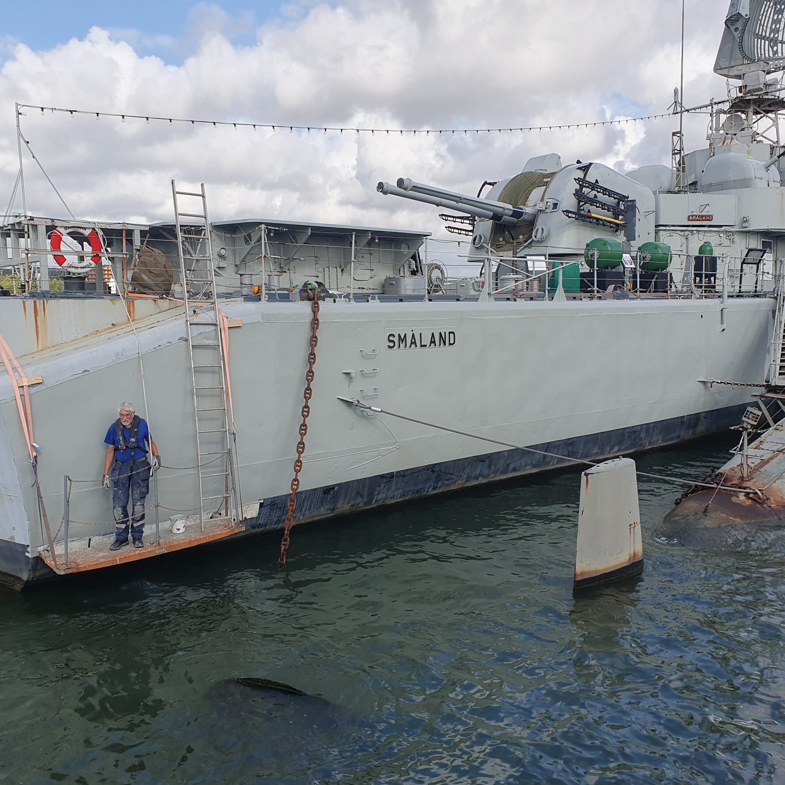 Att måla styrbordssidan akterut när det ligger en u-båt i vägen är inte helt okomplicerat. Det går inte att komma in med en flotte eller en båt. Lösningen blev att köpa in material och bygga en egen ställning som kunde sänkas ner till lämplig höjd. Arbeten september 2024.