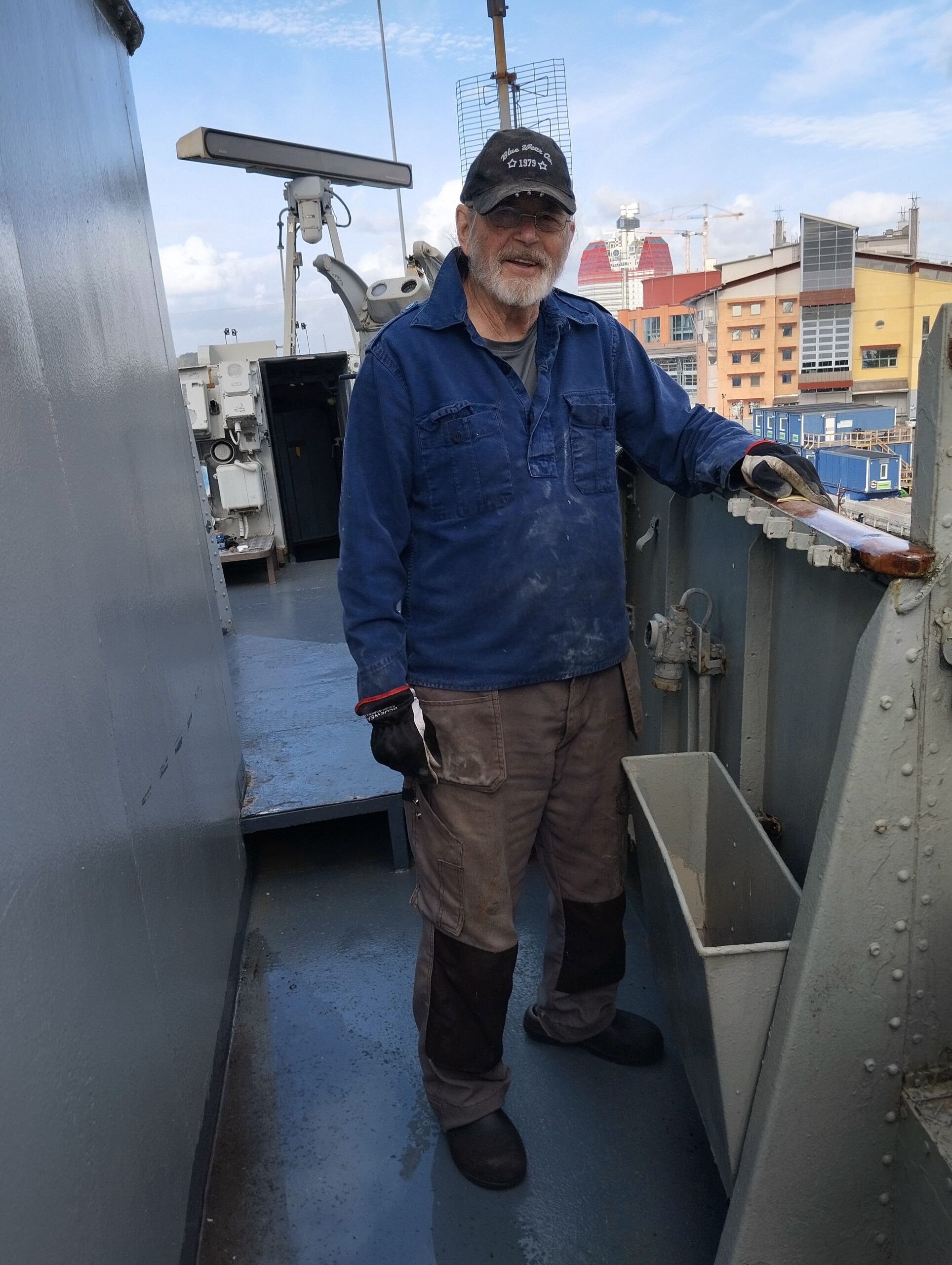 Knut Giertz, fd skeppsnummer 68, slipar och lackar på bryggan